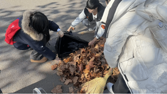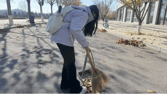 志愿者们拿起扫帚、撑开垃圾袋,把散落的秋意归整成清爽的风景:有人弯腰扫起连片的金黄,有人蹲身把落叶轻轻拢进袋中,扫帚摩挲地面的沙沙声,成了秋日最治愈的背景音。经过一番忙碌,原本铺满落叶的步道逐渐恢复整洁,志愿者们的身影与秋日校园的景致相映,成为一道温暖的风景线。